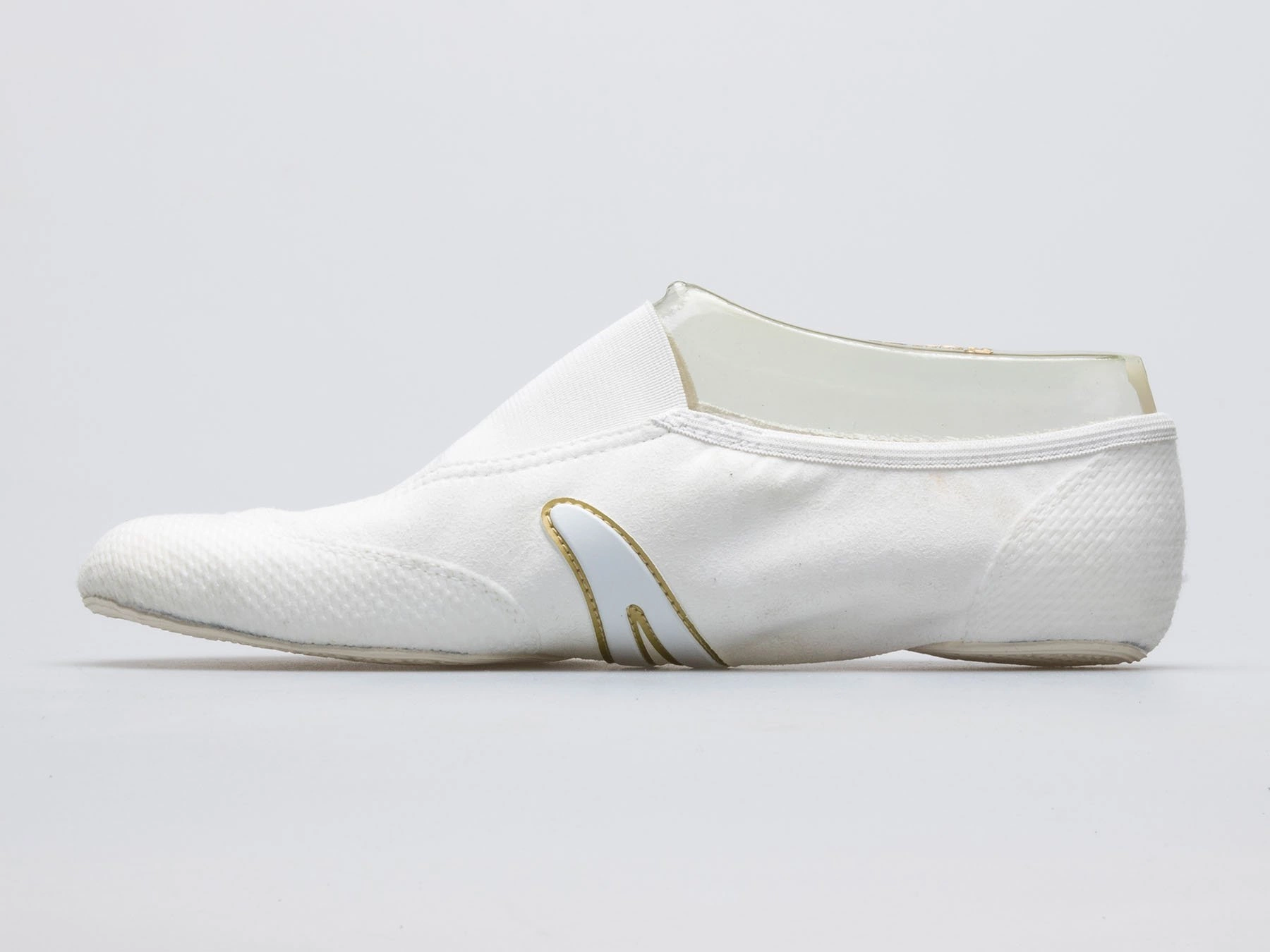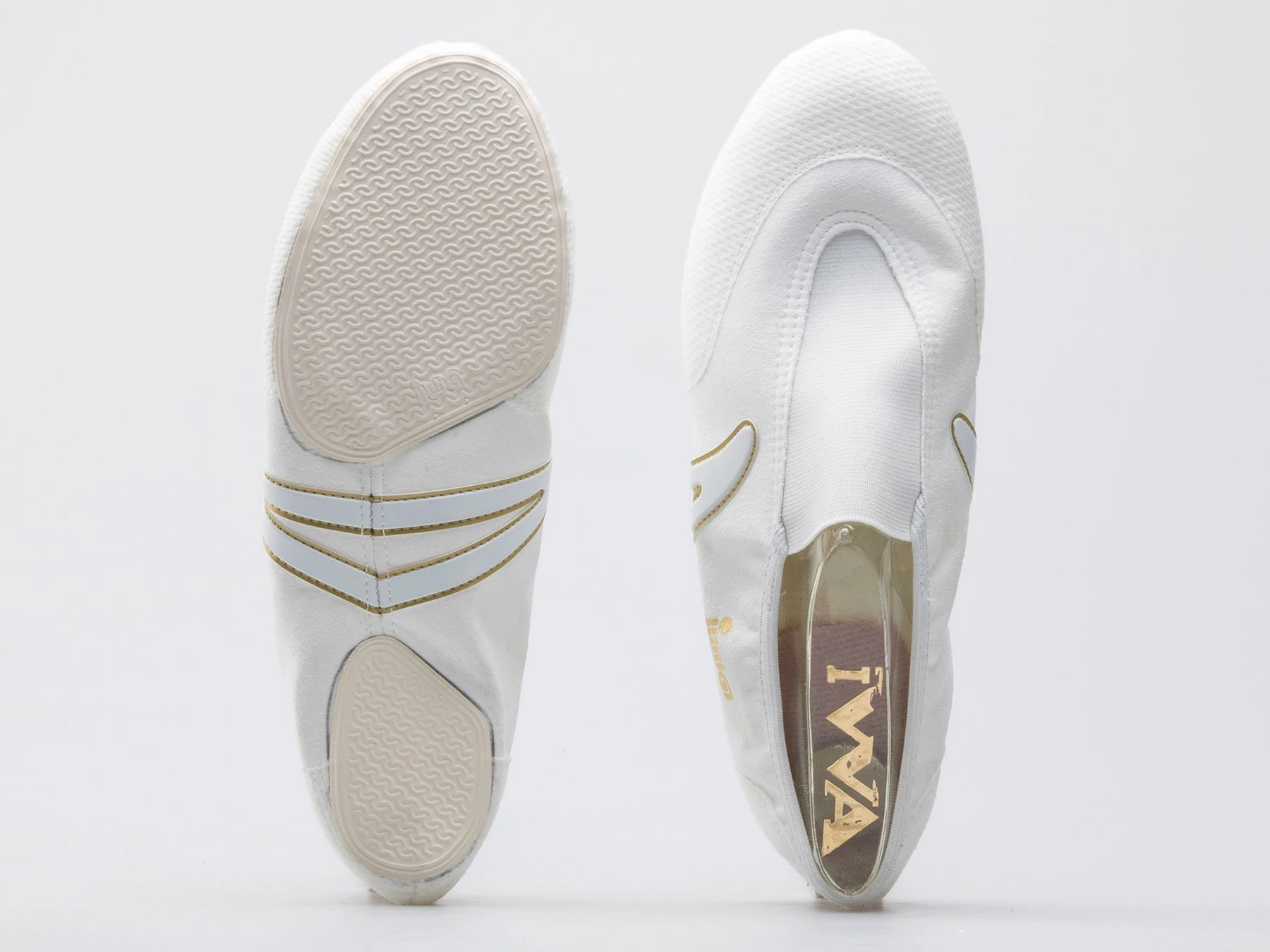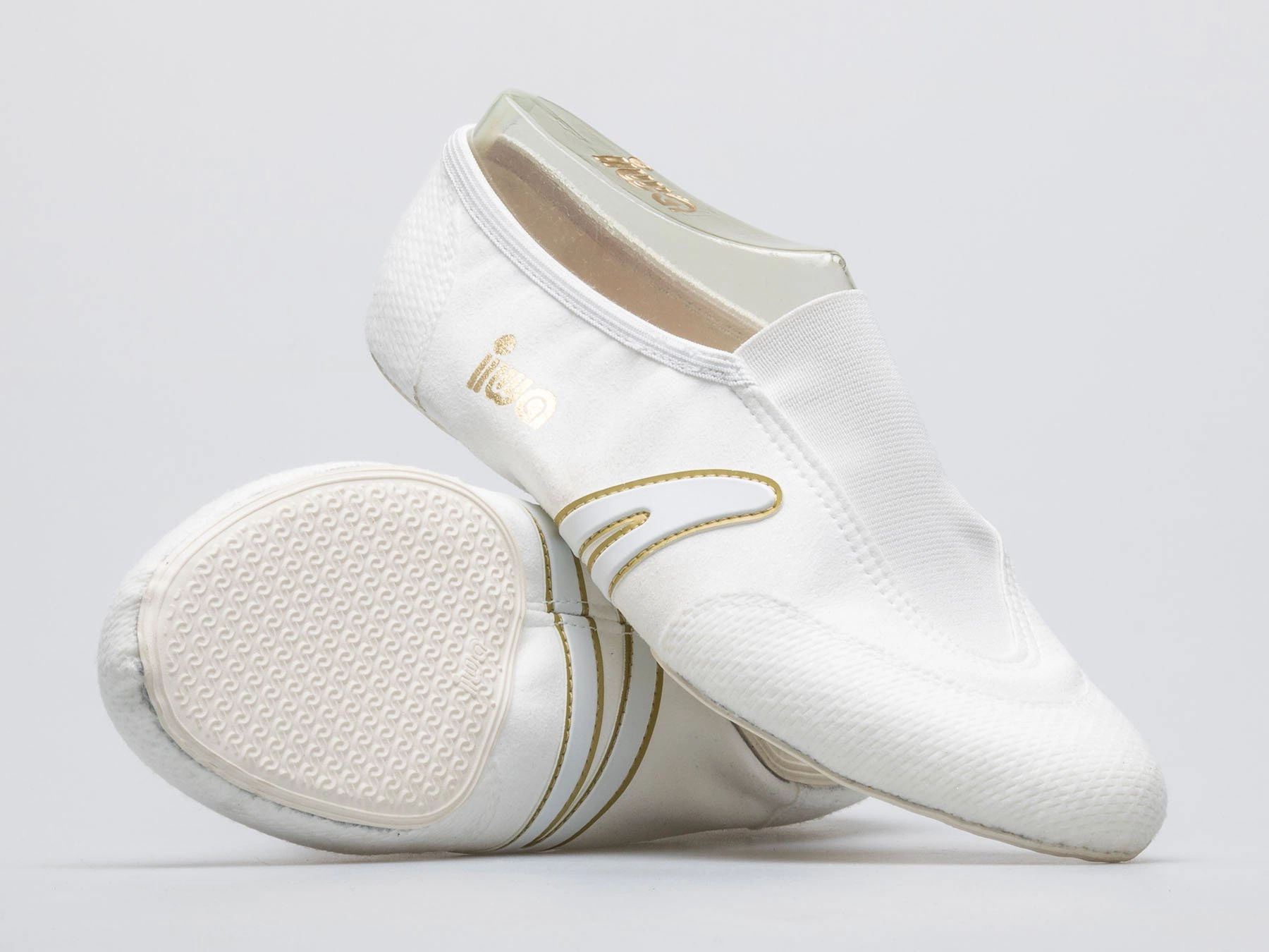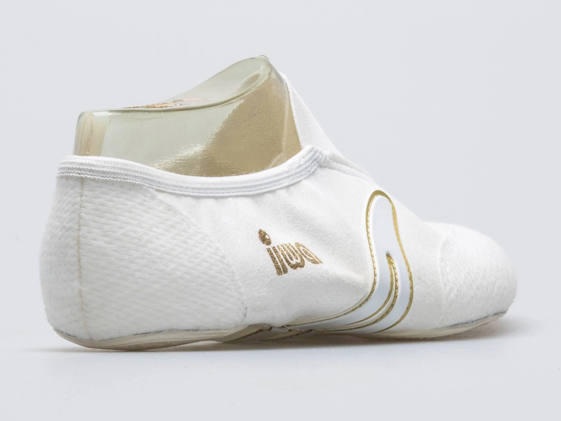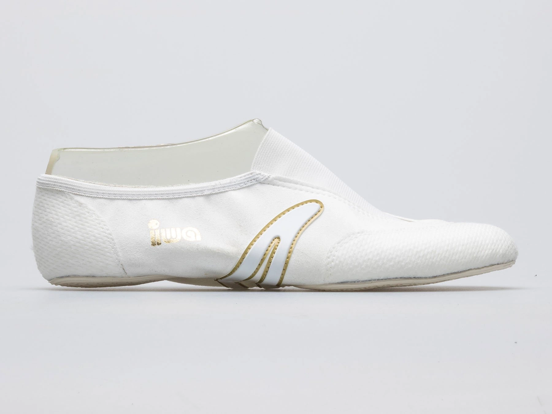 Dla najbardziej wymagających zawodników akrobatyki gimnastycznej mamy najwyższy model baletek gimnastycznych IWA 508 w kolorze białym. Specjalnie zaprojektowana cholewka dzięki wykorzystaniu wysokogatunkowych materiałów gwarantuje najwyższy poziom komfortu podczas ćwiczeń a jej fason oraz wizualne detale profesjonalny design. W modelu przeznaczonym głównie do skoków na trampolinie wykorzystano innowacyjny system ściągacza w postaci elastycznego grzbietu cholewki co pozawala na precyzyjne dopasowanie do stopy oraz zapobiega ześlizgiwaniu się obuwia podczas wykonywania akrobacji. W obuwiu dla najbardziej wymagających sportowców nie mogło zabraknąć specjalnej podeszwy opracowanej przez IWA Gymnastics. Guma wysokiej jakości została pokryta specjalnym bieżnikiem zapobiegającym poślizgom, a zintegrowana wkładka IWA-PowerGel umiejscowiona na wysokości pięty doskonale amortyzuje wstrząsy podczas skoków. Aby cieszyć się dłuższym użytkowaniem baletek zastosowano dodatkowe obszycia na piecie oraz w okolicach palców co zapobiega szybkim przetarciom znacznie wydłużając żywotność produktu. Model IWA 508 doskonale sprawdzi się również w skokach na ścieżce, rytmice czy gimnastyce korekcyjnej. Dowodem tego może być fakt, że jest on używany przez najlepszych akrobatów na salach gimnastycznych całego świata.